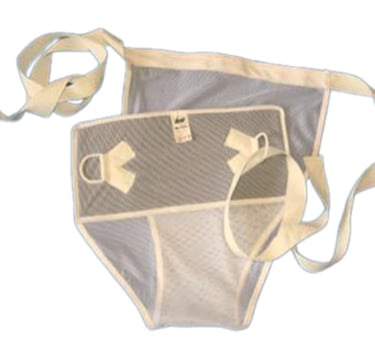 Pettorina in tessuto traforato indicata per pazienti costretti a prolungati periodi in carrozzina o su sedia comoda. Lo speciale disegno a “T” suggerisce la postura del paziente evitando il ribaltamento in avanti e lo scivolamento verso il basso. Dotata di nastri per il fissaggio regolabili mediante una fibbia scorrevole in plastica che la rendono adattabile a ogni circonferenza dell'addome e all'utilizzo su qualsiasi modello di carrozzina o comoda. La fibbia garantisce anche un “rapido sgancio” in caso di emergenza. Chiusura posteriore su pad con ganci.