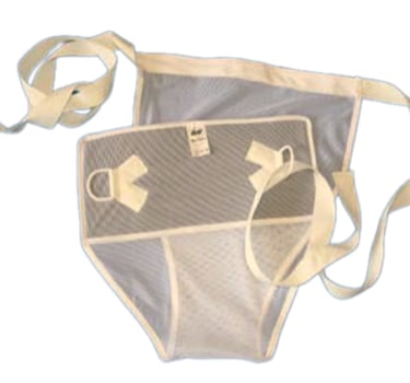 Padded pelvic belt, suitable for patients forced to spend prolonged periods in a wheelchair or on a commode. Design specially created to prevent the sliding forward of the pelvis, suggesting the right posture that guarantees leg separation and comfortable containment. Equipped with adjustable fastening straps using buckles for positioning on any model of wheelchair or commode. The buckle also guarantees a “quick release” in case of emergency. Closing on wheelchair uprights. Universal size (52x30 cm).