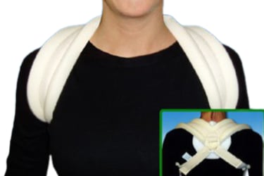 SP205 Clavicolar corset richard ring: Device made of expanded polyurethane and polyamide. Adjustment and rear closure with ring hook and Velcro. Indicated for the treatment of clavicular fractures.