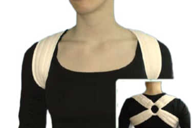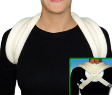 SP202 Clavicolar corset richard type: Device made of expanded polyurethane covered of jersey cotton. Reiforced from two rigid tape. Adjustment and rear closure with hook and Velcro. Indicated for the treatment of clavicular fractures.