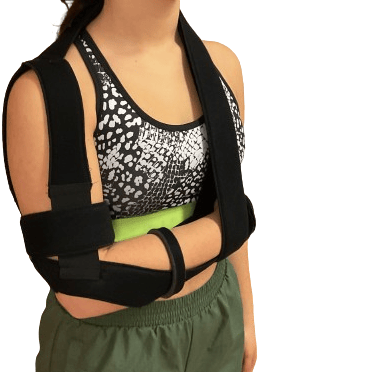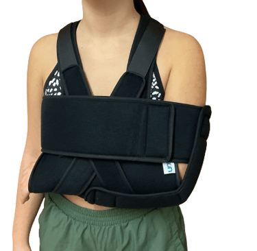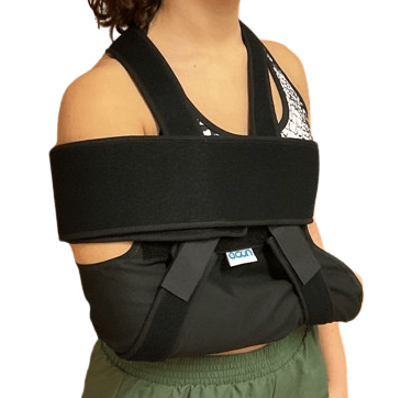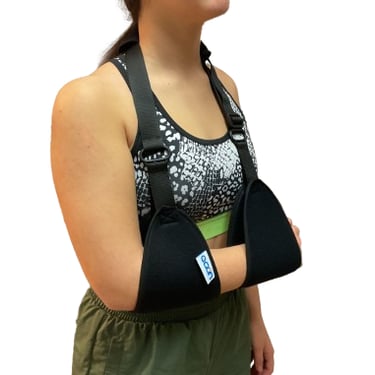 AS115 Arm sling type "Volpeaux Delux": Made of lightweight fabric, equipped with a polyurethane strap coupled to polyamide for better comfort, equipped with a thumb support that prevents the wrist from falling. Adjustable Velcro closure . Ambidextrous; available in a single colour (black). Available in six sizes.