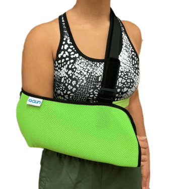 AS109T Perforated arm sling comfort: Device made of perforated synthetic fabric to ensure a better breathability. Equipped with a thumb support that prevents the wrist from falling. Closure by strap and self-locking buckle. Ambidextrous; available in two colours (yellow fluo and green fluo).