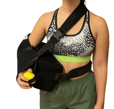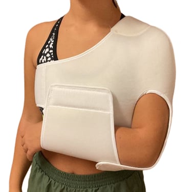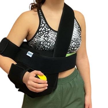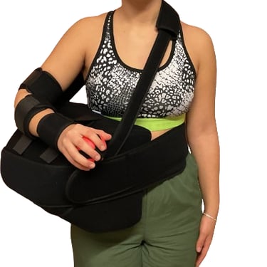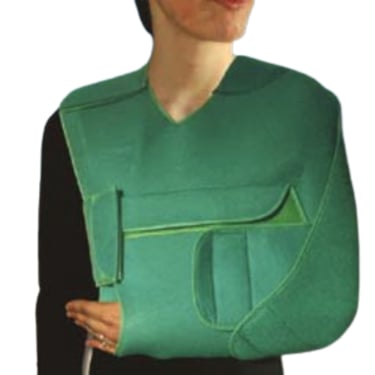 AS101 Arm/shoulder support comfort: Made of polyurethane and polyamide. Composed of a pocket for the accommodation of the arm, a removable transverse band to ensure the perfect stability of the arm and the shoulder and a shaped flap for the immobilization of the elbow. Adjustable closure by velcro. Ambidextrous. Avaiable in black color. Available in eight sizes.