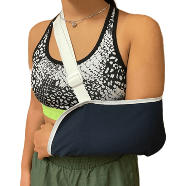 AS105 Arm sling: Device made of synthetic fabric. Equipped with a thumb support that prevents the wrist from falling. Closure by strap and self-locking buckle. Ambidextrous; available in two colours (blue and black). Available in four sizes.
