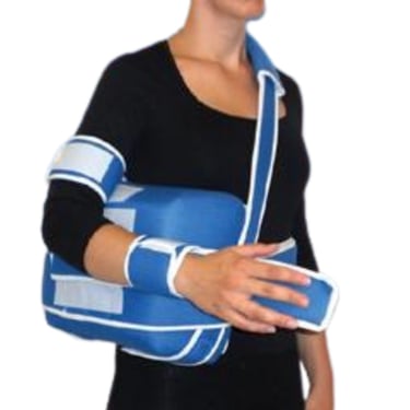 SP306: Designed to suggest the posture of the shoulder joint in abduction 40° or 70° Made with an anatomical shape in polyurethane coupled with velcro fabric. Equipped with a aluminium splint covered in velcro fabic for the immobilization of the arm. Ambidextrous; universal size; available in two colours (black and blue).